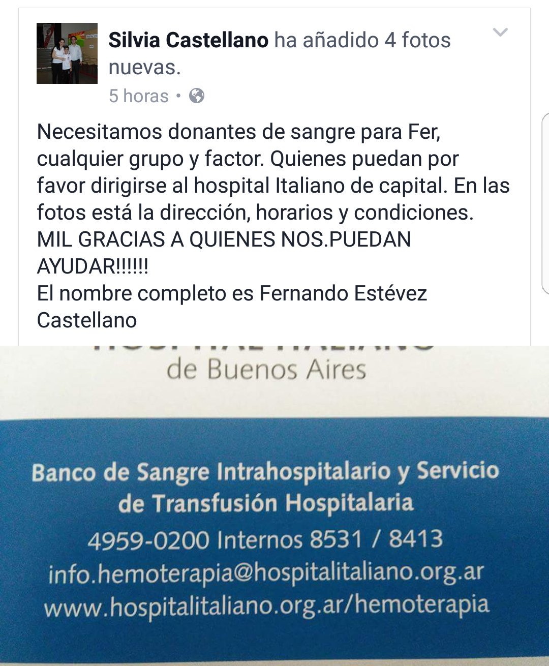 - Facebook Manolo Menendez: AMIGOS !!! PEDIDO URGENTE!!! ESTAMOS NECESITANDO 8 DADORES DE SANGRE 0 POSITIVO PARA GRACIELA ORTIZ.TIENE QUE PRESENTARSE EN INSTITUTO JUAN XXIII DE GENERAL ROCA MAÑANA 14 ANTES DE LAS 8 HS. QUIEN QUIERA VIAJAR LO LLEVAN. COMUNICARSE AL 2920 .522680. COMPARTIR. CADENAS DE FAVORES DE SALUD!!!